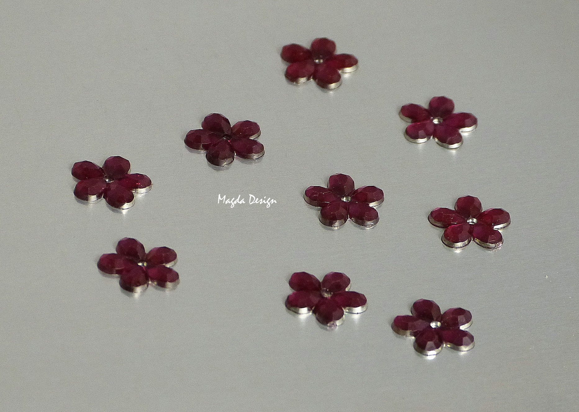 Našívací plastové ozdoby ve tvaru květinky lze využít jak k ozdobení textilních doplňků, tak k našití na společenské šaty.