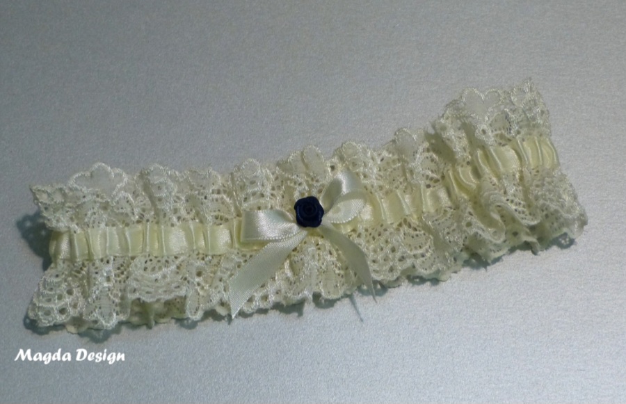 Ivory krajkový podvazek zdobený mašličkou a aplikací tmavě modré růžičky