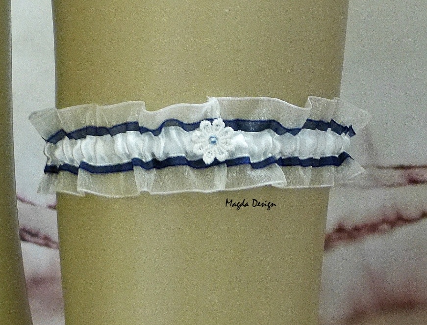 Ivory šifonový podvazek zdobený tmavě modrou šifonovou stuhou, ivory saténovou stuhou a krajkovým kvítkem.
