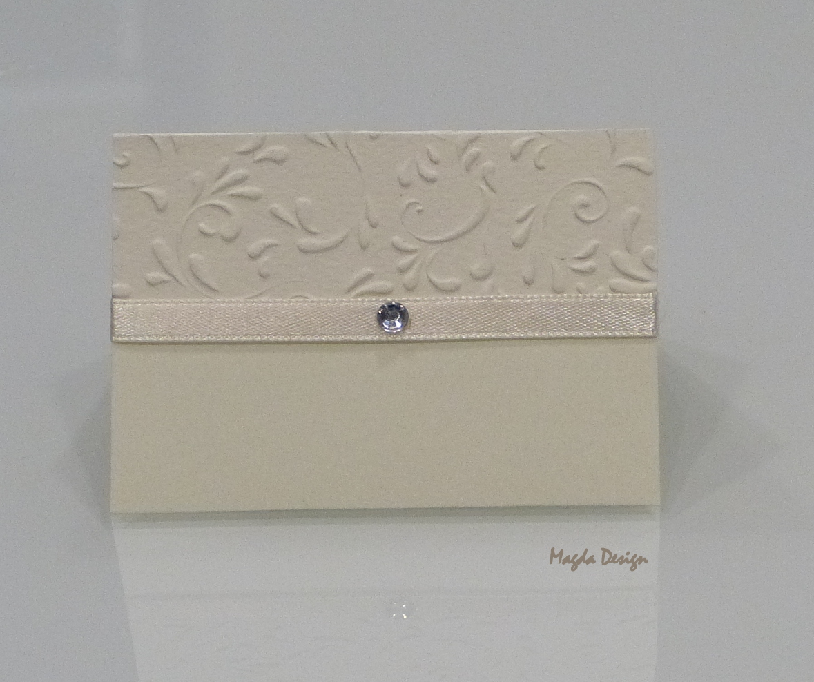 Ivory jmenovka s doplňkem embosovného papíru zdobená ivory saténovou stuhou a kamínkem.