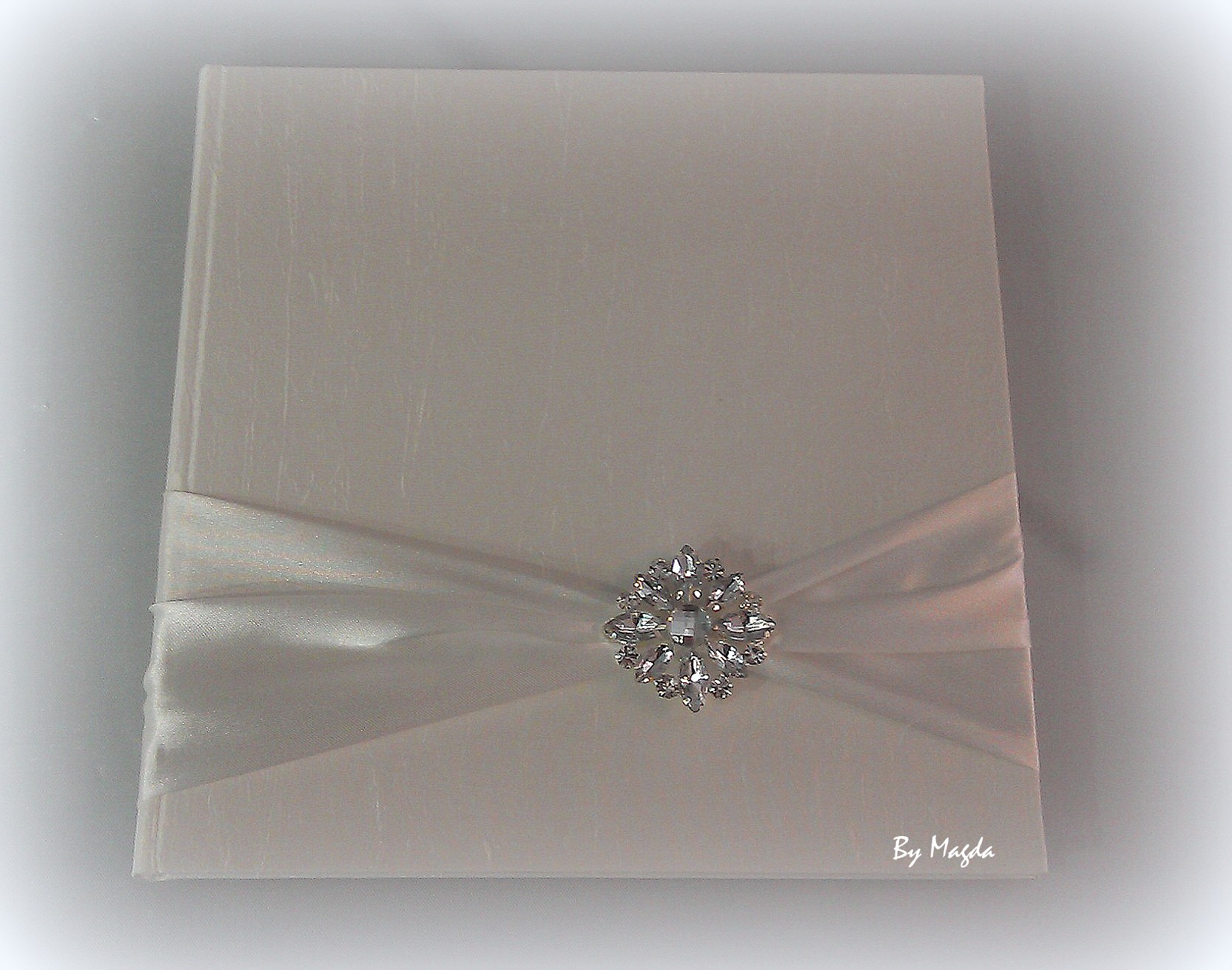 Bílá saténová svatební kniha hostů o rozměrů 20 x 20 cm zdobená bílou saténovou tuhou a sponkou s kamínky.