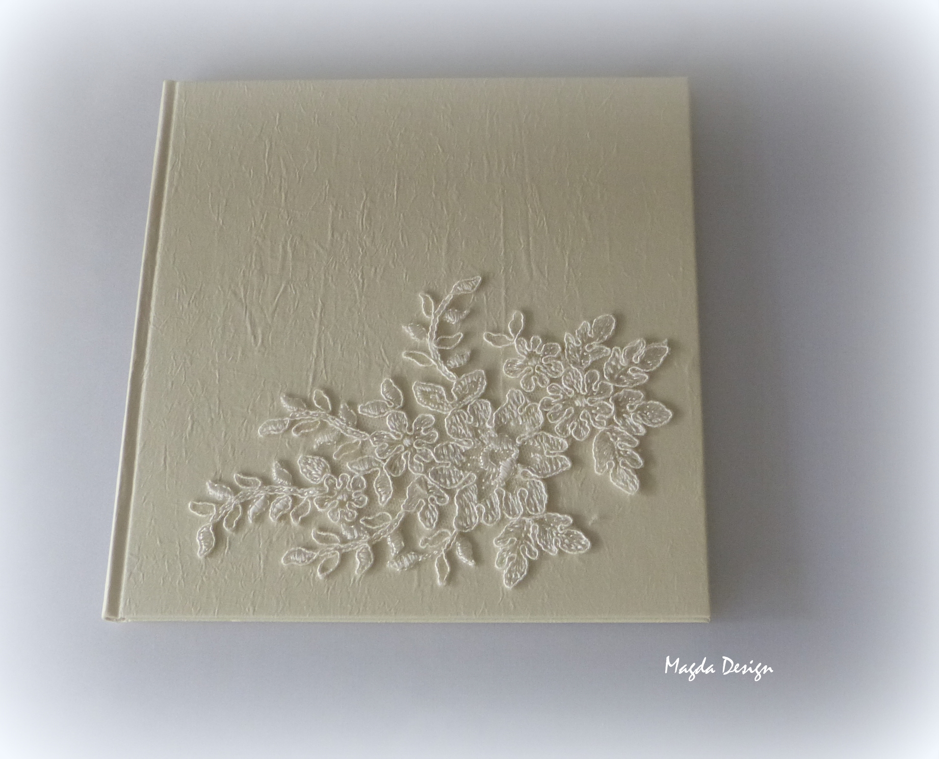 Ivory kniha hostů zdobená aplikací (francouzská krajka) Kniha má šitou vazbu a je ve velikosti 20 x 20 cm.