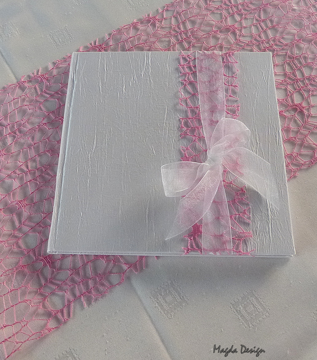Bílá saténová svatební kniha hostů o rozměrů 20 x 20 cm zdobená růžovou pavučinkou a šifonovou stuhou.
