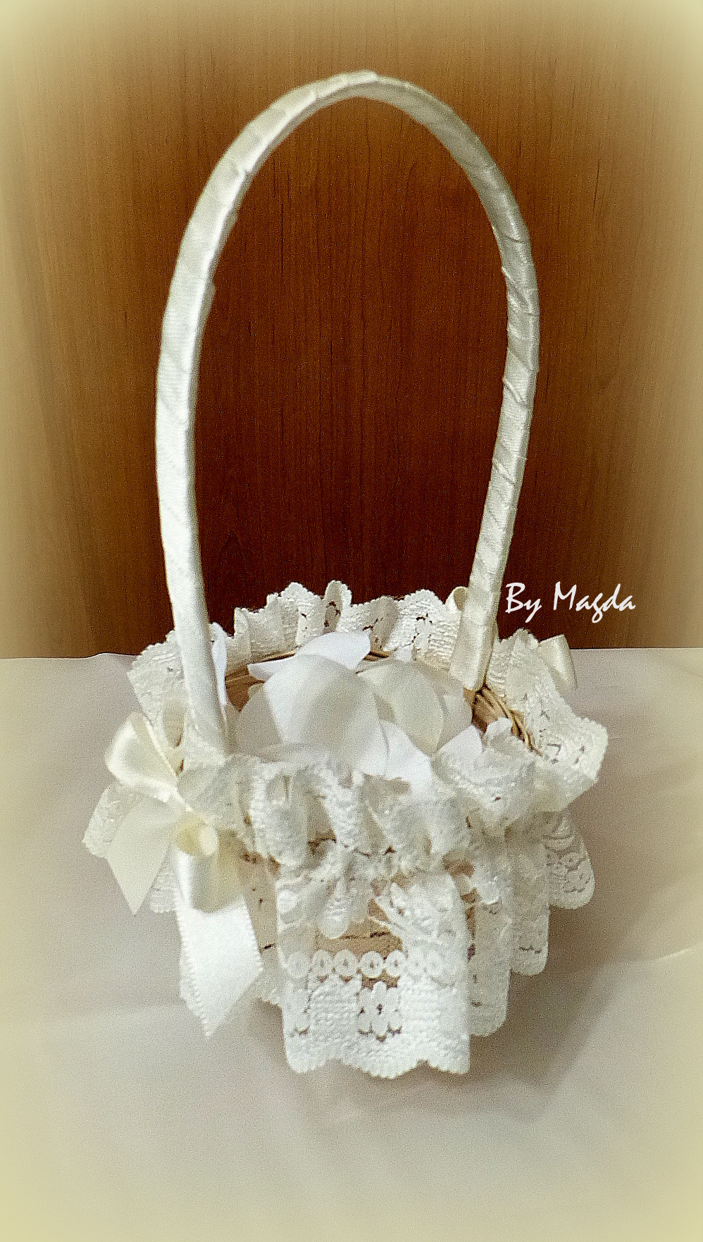 Košíček pro družičky zdobený krajkou a saténovou stuhou.