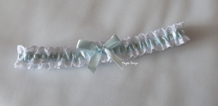 Bílý krajkový podvazek zdobený světle modrou saténovou stuhou s mašličkou.
