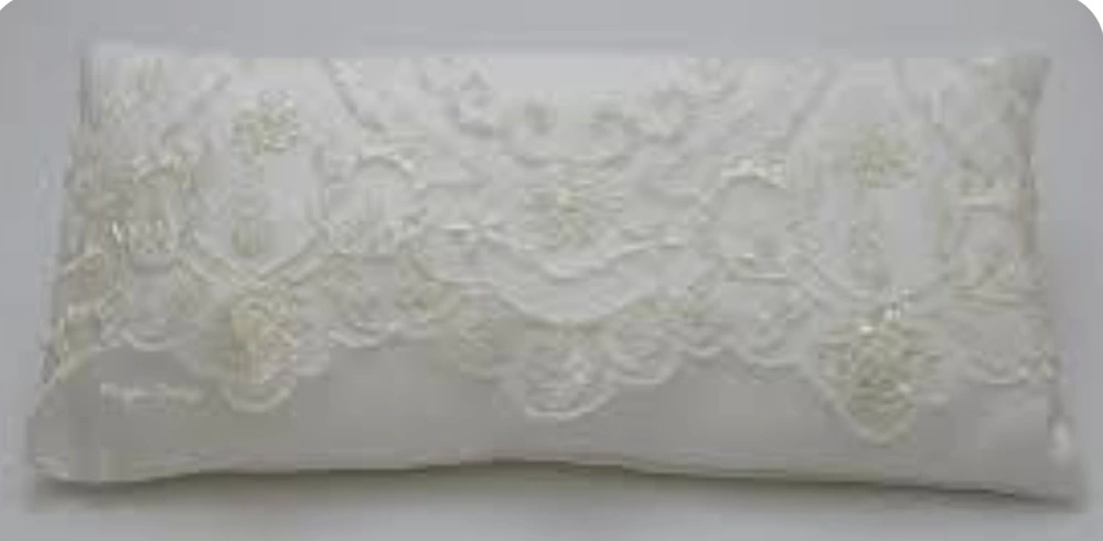Luxusní ivory saténový polštářek na prstýnky zdobený francouzskou krajkou s kamínky a flitry.