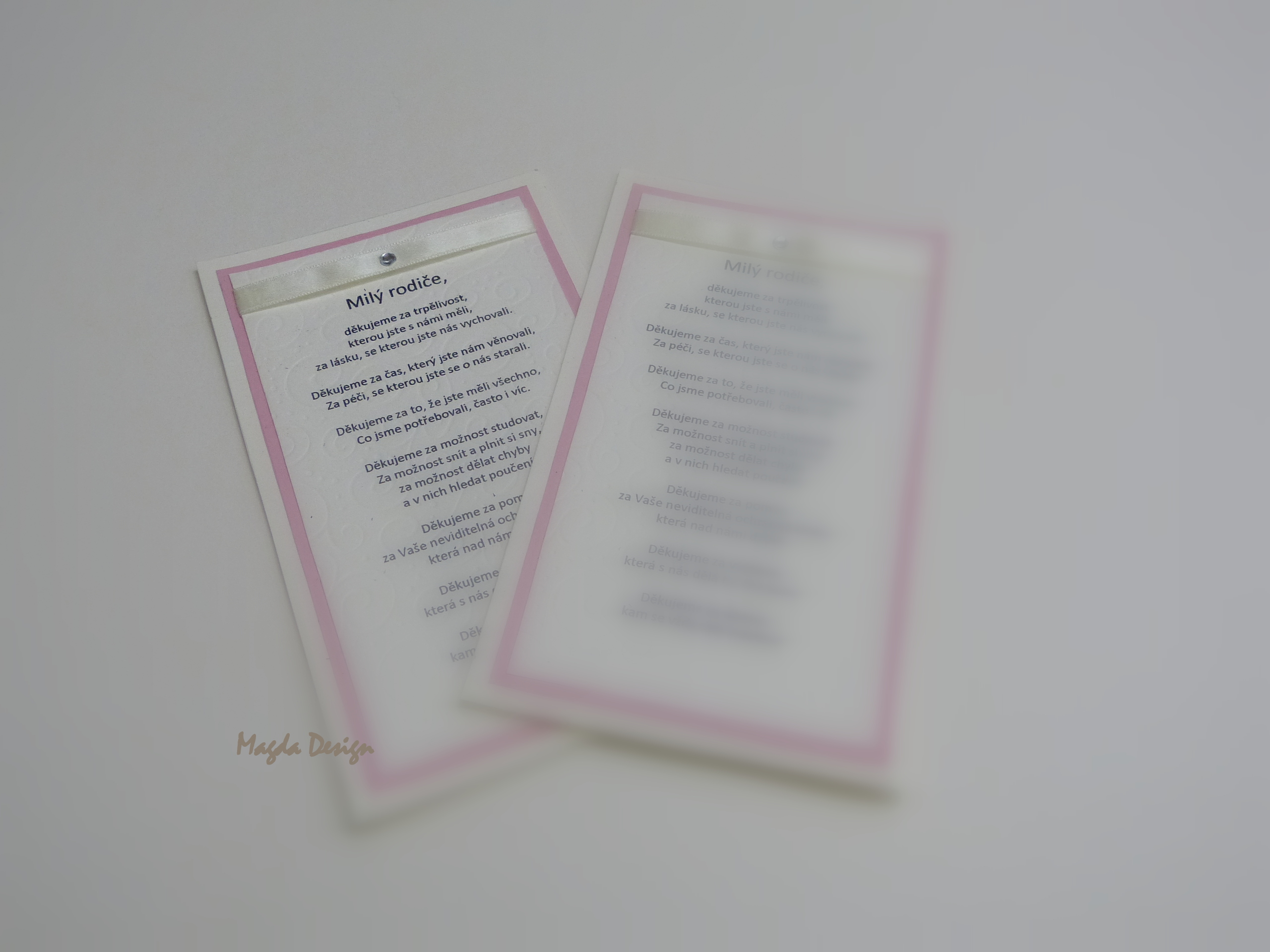 Poděkování rodičům - tisk na elegantním embosovaném papíru ivory barvy (lze vyměnit i za bílou barvu) doplněný rámečkem, saténovou stuhou a kaminkem.
