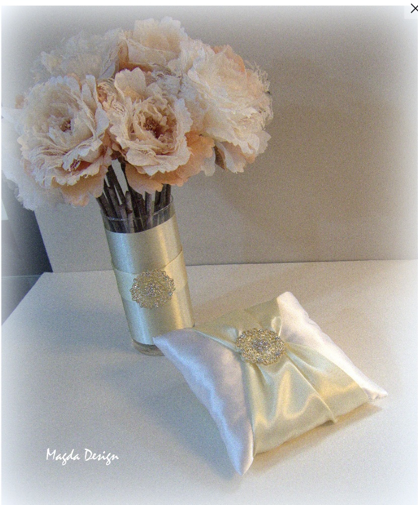 Ivory krajkový polštářek pod prstýnky zdobený saténovou stuhou a štrasem