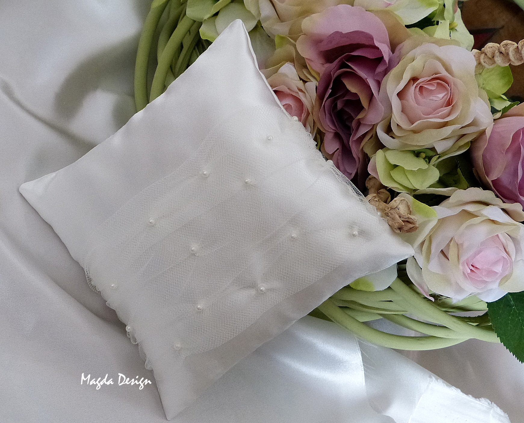 Ivory saténový polštářek pod prstýnky zdobený tylem s vyšívanými perličkami.
