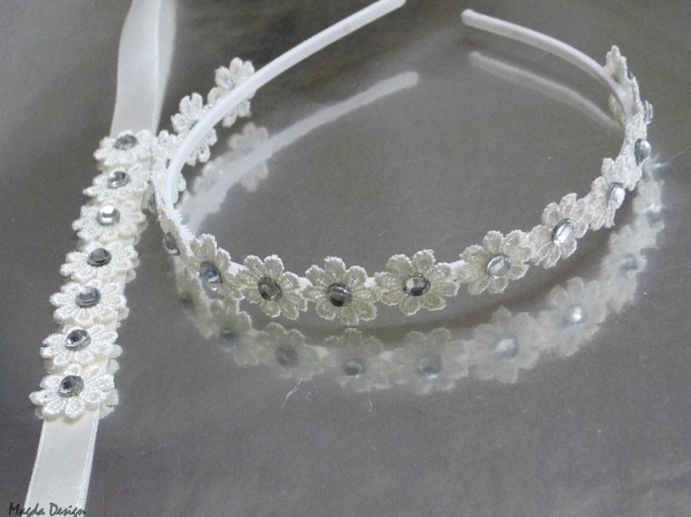 Souprava čelenky a náramku. Ivory krajka zdobená kamínky.