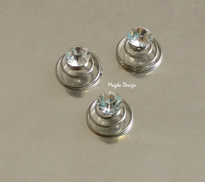 Vkusná dekorace k ozdobení účesu, různých úpletů, svetrů a podobně. Jednoduše zatočíte do účesu nebo úpletu. Pružinka má základnu 15mm, kónicky se zúžuje na 10mm, na výšku má 15mm. Barva kovu: platina, čirý kamínek