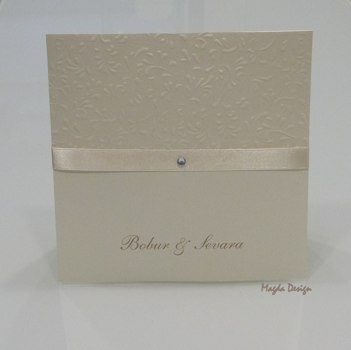 Elegantní a luxusní oznámení. Ivory matný papír v kombinaci s embosovaným a sténovou stuhou dávají oznámení jemnost a velikou eleganci.dozdobeno kamínkem.