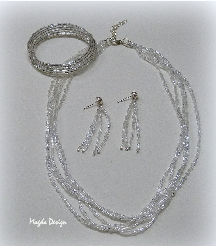 Jemňoučká souprava náhrdelníku, náušnic ,náramku vyrobená z malikných skleněných perleťových korálků .