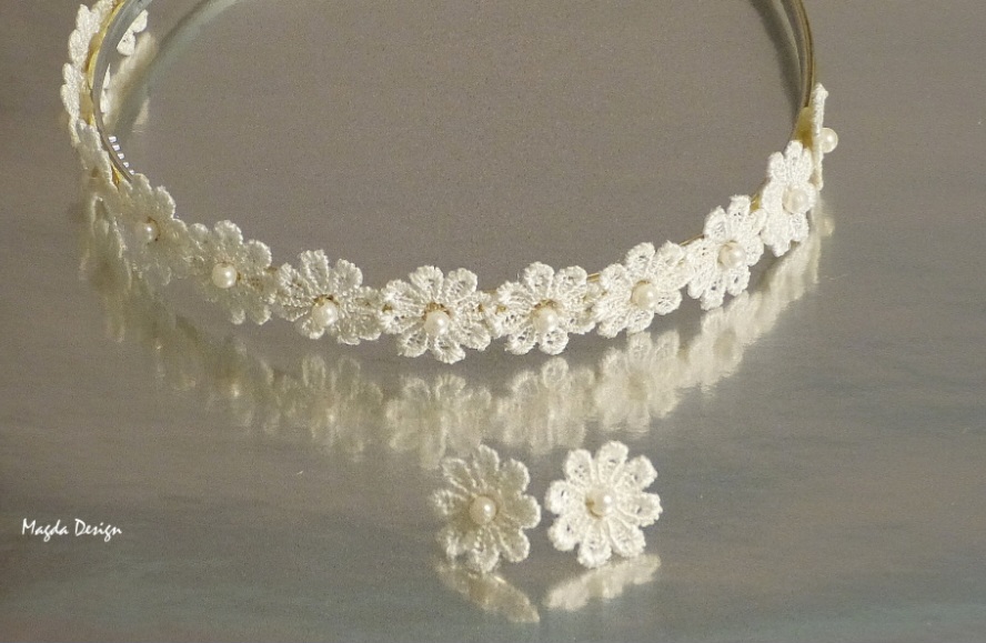 Souprava je složená s čelenky do vlasů a náušnic na pusetku. Vše sladěno do stejného designu dozdobené perličkami.