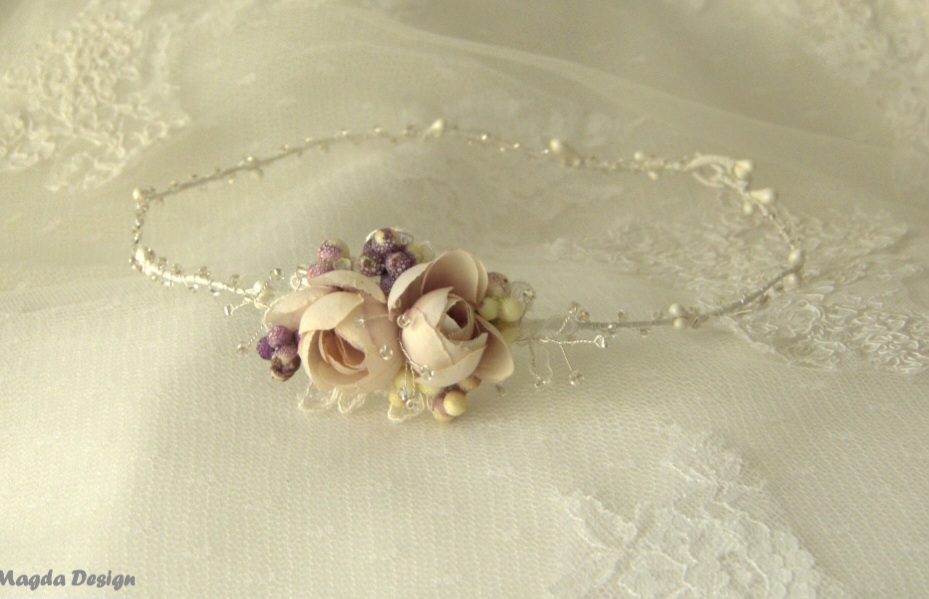 Věneček/tiara zdobená kvalitními látkovými květy , krajkou a skleněnými kamínky se stříbrnými odlesky.