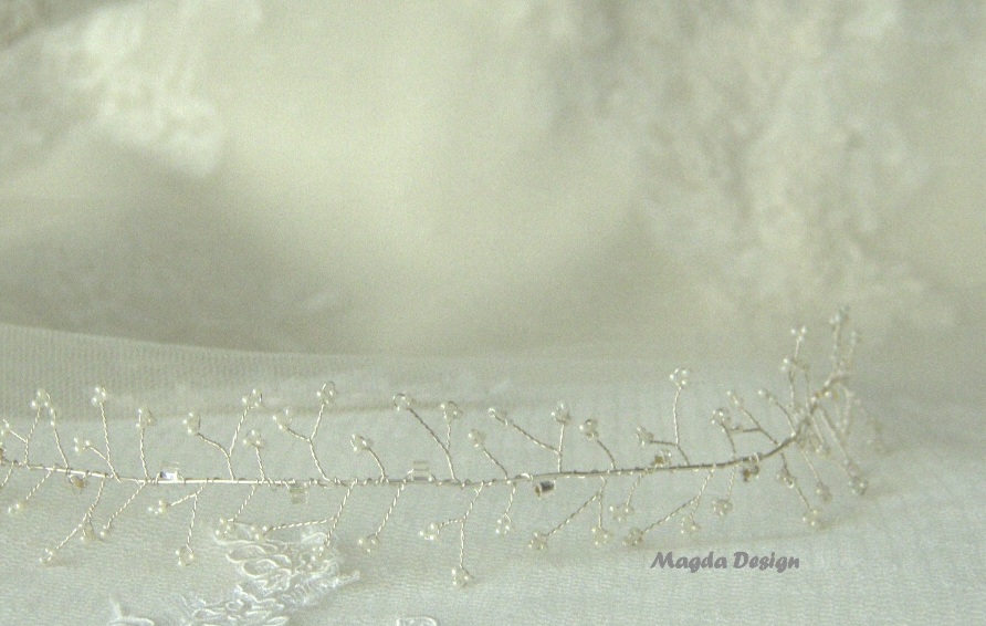 Věneček/tiara (24 cm) vyrobená s postříbřeného drátku, zdobená ivory perličkami a broušenými skleněnými kamínky se stříbrnými odlesky.