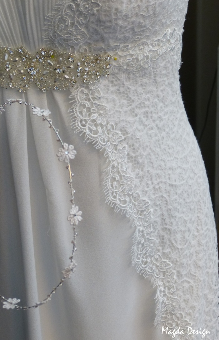 Věneček/tiara vyrobená s postříbřeného drátku, zdobená pudrovými květy s krajky a skleněnými kamínky.